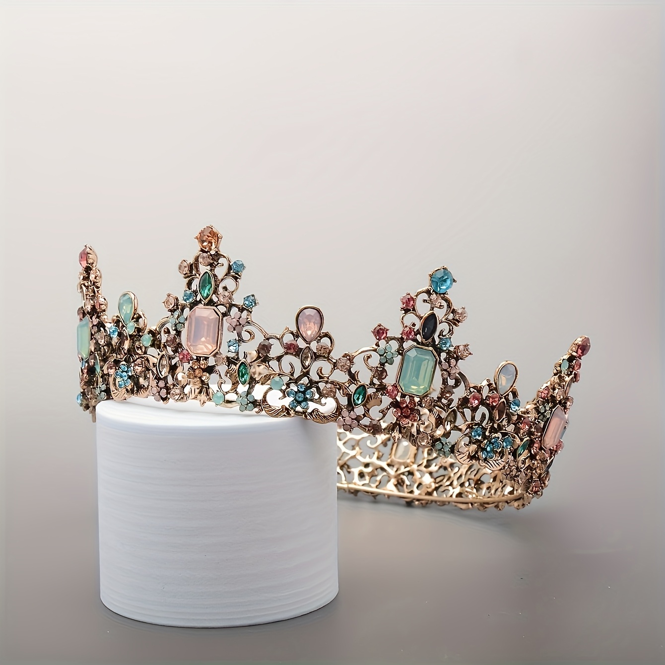 This breathtaking Pastel Gem Princess Crown is a true fairytale treasure, designed for little queens who love elegance and sparkle. Crafted in a warm antique gold tone, the crown features intricate filigree detailing adorned with softly shimmering pastel gemstones in blush pink, aqua blue, mint, and champagne hues.