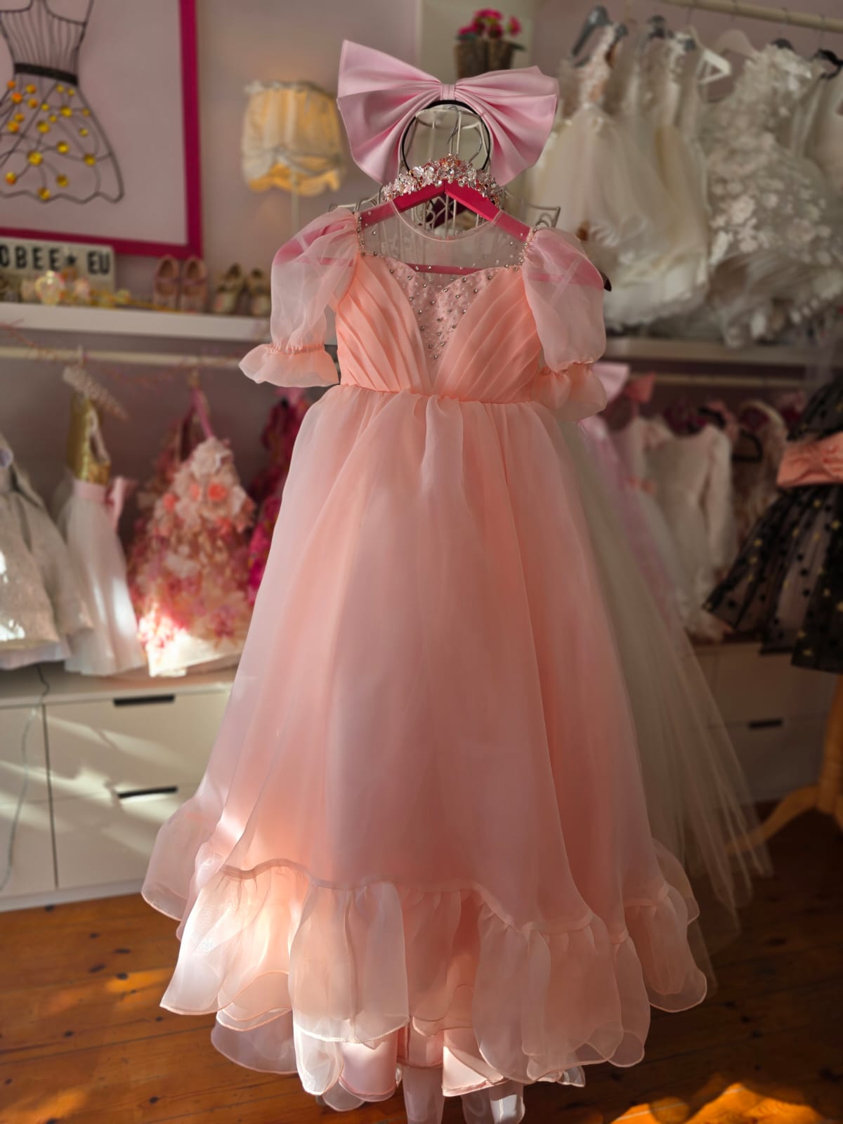 #PeachPartyDress, #FelicityDress, #LongPartyGown, #GirlsFormalWear, #FlowerGirlDress, #ElegantKidsFashion, #PrincessStyle, #SpecialOccasionDress, #BirthdayDress, #WeddingGuestDress, #TulleSkirtDress, #FeminineDesign, #CocoBeePrincess