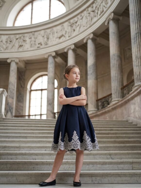 Princess Isabella Navy Blue Lace and Tulle Dress with Satin Bow